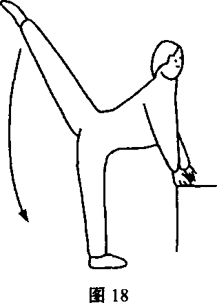 动作说明:双手扶支撑物,左腿支撑身体,右腿直膝,绷平脚背 向后上摆起,同时抬头、挺胸、直臂,右脚落地后,左脚再踢,踢的高 度根据个人所能为度(图18)。