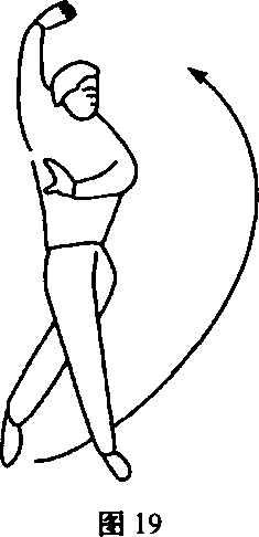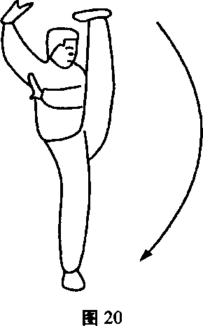 动作说明:右脚向前上步,身体左侧向前.左脚尖勾起向头上 踢,右掌上架于头上,左掌立于右腋下,左脚落地后,上右步,身体 右转180度,左脚尖勾起向头上踢(图19、图20) °左右腿互换练 习。