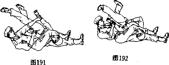 1:动作要领在格斗中,当我被敌人(或暴徒)用柔道中 的绞颈技锁制住时(图189),我可先用右手猛托砸其下我(图 190),以迫使其头部后倾.然后,可再用右腿挟制其颈部(图 19D,并直至其昏迷或窒息为止(图192)。