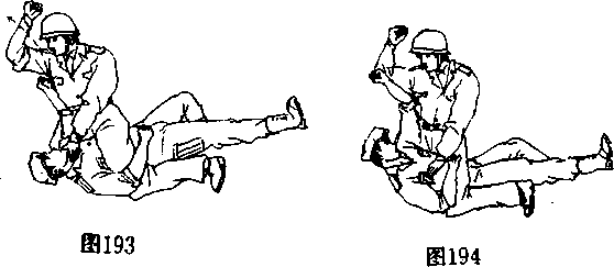 L动作要领 在格斗中,当敌人骑在我身上,并欲挥手下 砸时(图193),我可速用左臂格挡其小臂《图194),同时将右 拳猛力击向对手心脏部位(图195).将其击倒在地「再翻身骑