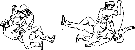 2 .动作要求左臂格挡 快而有力;击胸要连贯、准 确、凶狠、及时;翻身骑压敌 人要迅速;右拳下砸要凶猛, 必要时可连续重击其头部* 当然也可抓起石块进行击 打。