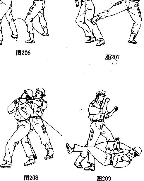 L动作要在格斗中,当我从背后突然接近敌人时(图 2。6),可突然用右脚狠踹敌膝关节(图207),同时迅速用右臂 锁紧敌喉咙(图208),以迫使其气绝'如果需要快速结束战 斗,可用右臂将敌人甩倒在地(图209),并用右膝顺势攻击敌 面部(图210);当然也可连续用肘予以致命攻击(图211),将 敌制服或击毙。