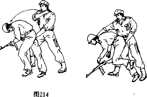 敌人生殖器(图213);紧接着,将左手猛力上提(图214、将敌 凌空提起;同时可将右掌狠砍向敌人后颈部位(图215),将敌 击毙。