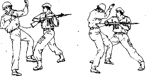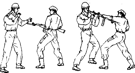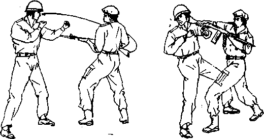 当用带枪剌的步枪或冲锋枪进行肉搏战时,一定要用步 枪中部进行格挡'以求控制对手的动作.若敌先下手,可根据 其动作的破绽寻机进行反击*切记用枪托底部和刺刀攻击最 为有效,并须注意避免使自己的动作过大'即对于对手的剌扎 只需用刺刀轻轻一拨改变其方向即可。如果动作过大,自己就 会失去平衡,