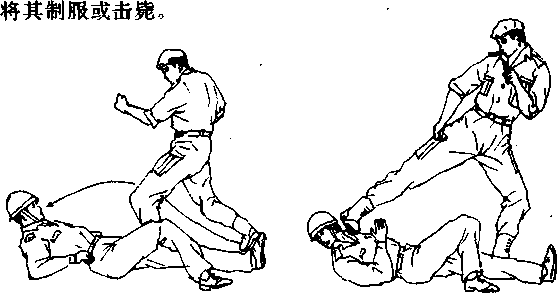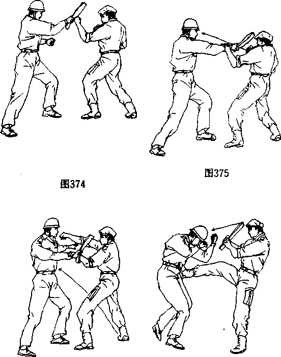 L动作要领 在格斗中,当故人用警棍或短棍向我头部 横扫过来时,我先下蹲避过(图374),并乘其击空的瞬间,顺 势用左手向自己右方控制其右臂(图375),以防其反手攻击“ 然后可再用右拳猛击其面部(图376”素接着,再用右脚踢其 肋部或小腹(图377)>将其击昏或击倒*最后,再将夺来的短 棍重重击向敌头部(图378),将其制服或击毙(图379) o