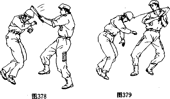 L动作要领 在格斗中,当故人持警棍或短棍击来时.我 先仰身并向后退避(图380),而且不待敌人重新攻击,就抢时 间抬右脚以侧踹腿攻向敌人胸部《图381);然后不待敌人退