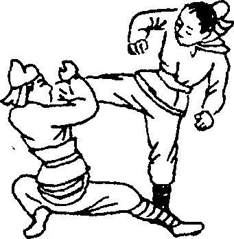 【技击动作】在与敌打斗时,敌以右脚向我头部左侧点 踢,我速起右膺向左格挡敌腿,随之我两腿屈膝卞蹲,速出 右腿向敌支撑之腿横扫,似白蛇盘树之状,敌因注意力在上. 而下体遭到突然缠绊而向后跌倒(图217)。