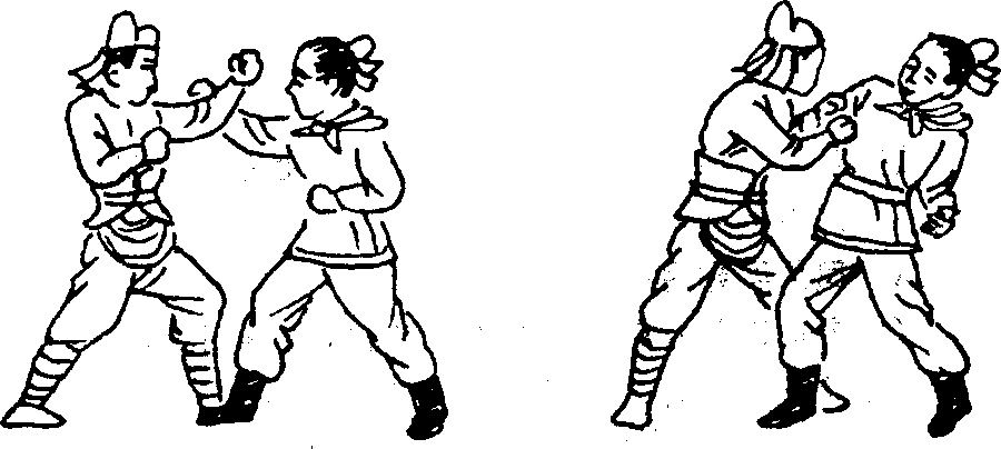 【技击动作】在与敌对抗中,敌若以右直拳向我胸部击 打,我出左小胃向外格挡敌拳(图220),同时左脚速进步绊 住敌腿,随之我再用左小臂下压敌右臂,右拳心贴己小臂内 侧,配合左小臂用力撞击敌胸部,似武松脱铐状(图221)o 敌因我突然拧腰转体用臂撞击而向后仰倒。