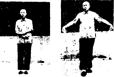 』松肩坠肘.两手抬起,在腹前相互交义,f心朝r.,手 指微拢,i图I时)