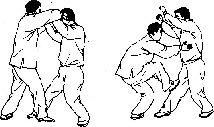 甲上右脚,伸双拳直击乙胸腹部,乙左脚微后一撤,右脚回拉,同时用双掌由上往下交叉盖扑甲 双臂;此动不停,乙紧接着右脚往前一迈,以右脚 带动左脚,使双拳从外向里击打甲两太阳穴或两腮 (图3-17);甲双手往上屈肘防护,乙一击甲头后迅 即下落环绕甲臂由甲两臂下横掌击甲两肋,同时进 身以右脚踩甲左脚面或左膝,将甲击出。(图3 - 18)图3-17 打 图3—18