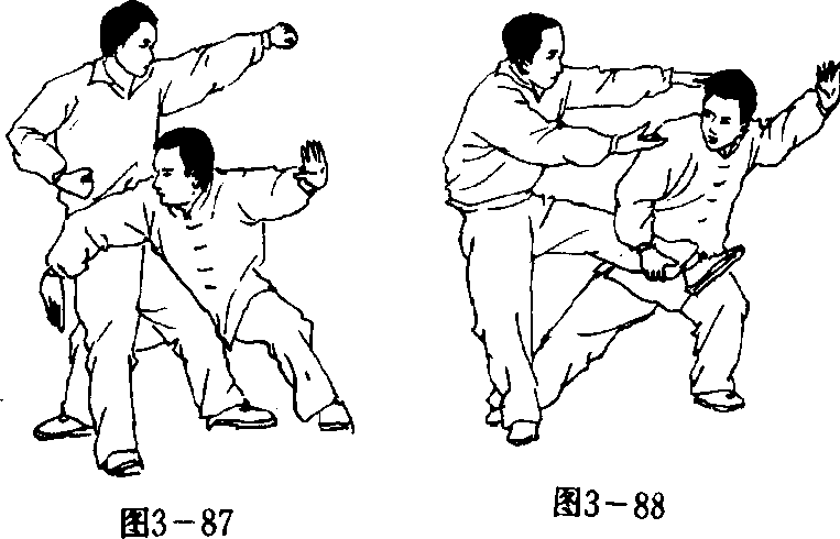 乙左脚前进一步,以右掌反背摔击甲头部,不 管是否击中,乙右臂反转下移,右腿往甲身后一插, 以肩臂靠甲,将甲挤倒(图3 — 87);甲必移身闪化 或提腿用双手搬扭乙头,此时,乙速向左侧闪化,以? 163 ?右手一抄甲前脚,右脚勾扫甲后脚将甲向倒。(图3-88)