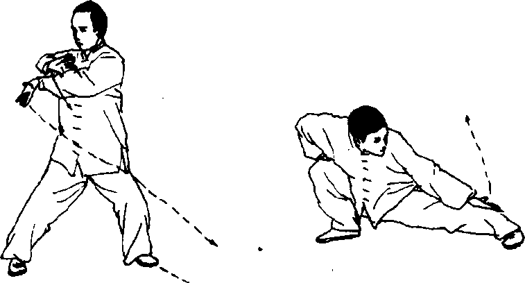 时向左伸出,左腿伸直;右腿屈膝下蹲,右脚尖里 扣成左赴步式,重心放右腿;随左腿外伸,左掌臂 内含滚裹之力由外向里旋转,变掌心向上,拇指一 侧朝外,向左腿外侧伸出;头亦随之向左稍转,上 身微前俯,眼看左掌。(图2 — 82)