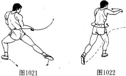右脚在右侧落步,屈膝、身体向左旋转并前倾。左脚后退 一小步,脚跟抬起。右拳向右斜前方摆击,拳面向斜前方,拳心 向下,臂略屈;目视右拳(图1022)<,要领:左脚移步切勿离地太高,重心前移与转体、出拳要 协调,右手臂略内屈,右拳要沿左脚移动之后经过两脚的直线 方向击出。实用法:对方拳脚沿直线攻击我上盘时,我转体移步闪 避,同时挥拳反击。或连接上动运用,我方落步于对方前锋腿 的内侧或外侧,使其不便移动前脚,右拳同时重击之。