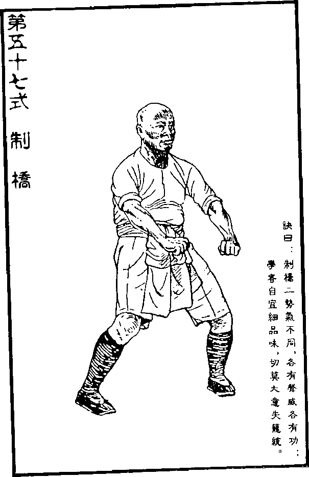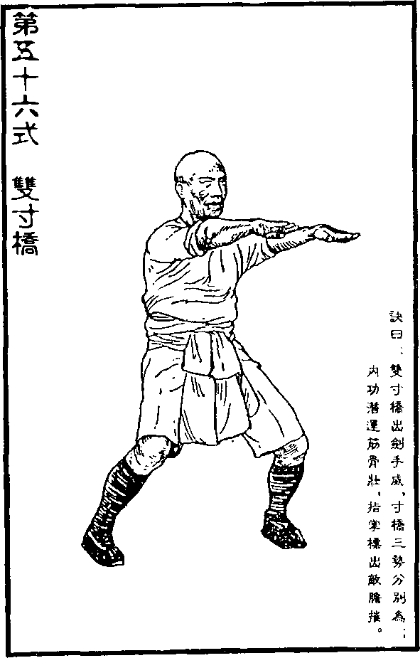 【编者按】寸桥乃洪拳十二桥手之一,有左右寸桥(第六 式)、侧身寸桥(即单寸桥,见第三十三式)、与此双寸桥三势臼 习者当留意其与标串掌之区别。