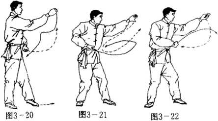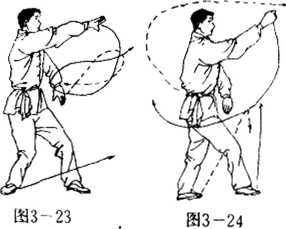 脚不动。右手再向前向左划圈,握拳收于腹前。左手同时 向左划圈,然后向前引手,握单风眼拳,使掌背弹力(图3- 22)。