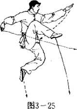 右脚向上蹬跳,左脚同时向上摆动,右手向后变掌甩扒, 左手先向后,然后变掌向前直臂抡动,做盖踏掌法,力达满掌. 在盖踏掌之时,左右腿在空中交换腿,右提膝在上,左腿屈曲 收于右腿之下(图3-25)。