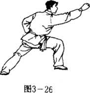 左脚1落地,并向前蹬动,右脚落弛,在左脚的蹬动推送下, 向前跨出成弓步。同时,左手回收于腰间,以掌护腹,右手向前 做钻拳,力达中指之中节(图3 -26).