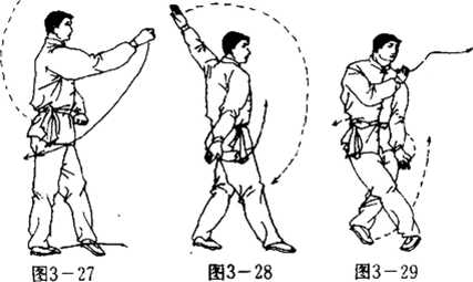 右手向后直营引领抡动,右手向下向后垂下并展胸,挺 腰。同时右脚向前一步,做好前劈臂准备(图3-28).