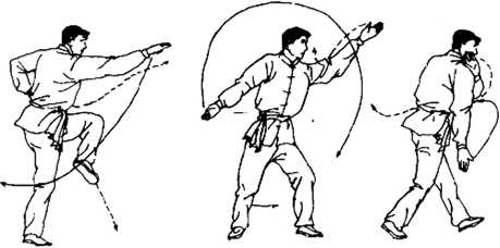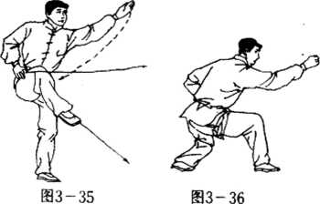 右手向后回收撤于腰间,左手向前、向远、直臂抡踏掌而 出,力在满掌。同时,右脚抬起提膝,护于裆前(图3-35).