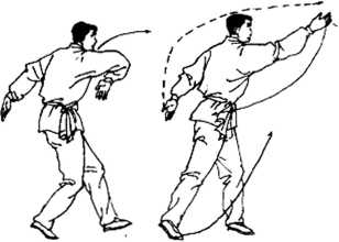 身体事心微微升起,右手掌背向前.向远划弧捽掌而出, 身体前倾,,目直视(图3—34)。