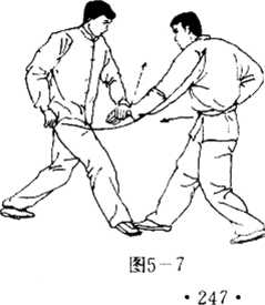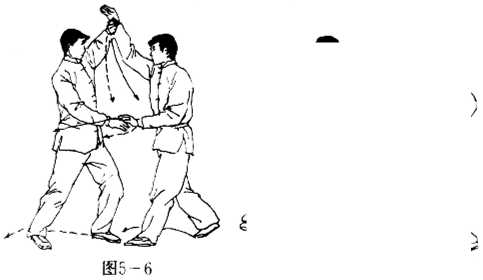 进攻力,同时上左步于敌右脚后,右手向前使拍踏掌击于敌脸 部正面,使敌被制(图5-9).