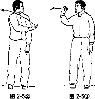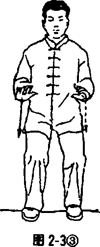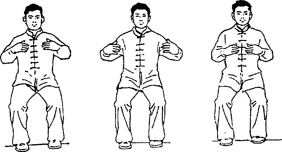 从无极桩开始,两手臂作稍向外棚和稍向内收的练习。 一开一合,“开”时吸气,“合”时呼气。呼吸要自然畅通,不可憋 气。呼吸的深度逐渐加长。每次练习4?6分钟(见图2-2)。