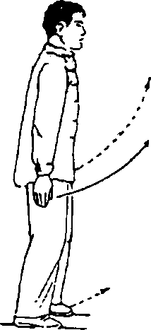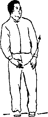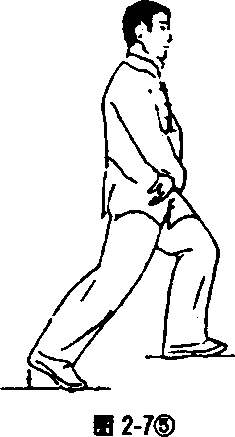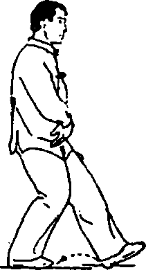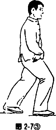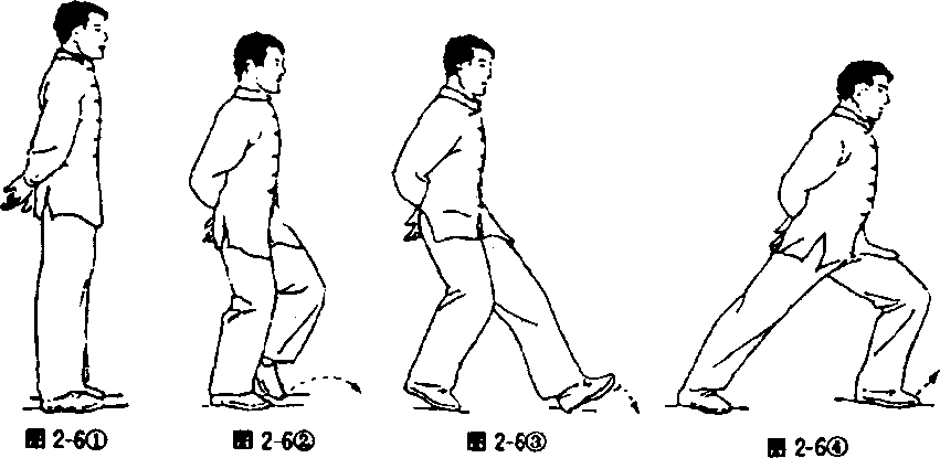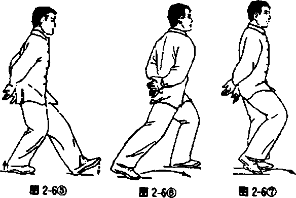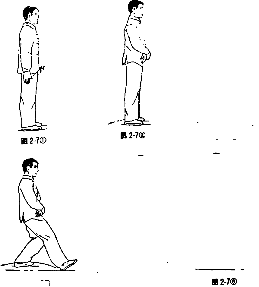 身体自然直立,两手背贴附后腰两侧(见图2-6①)。两腿 屈膝,重心移至右腿(见图2-6②),左腿抬起向前上一步,脚 跟着地成虚步(见图2-6③)。重心移至左腿,全脚着地,成左 弓步(见图2-6④),目视前方。接着后坐,重心后移,右腿屈 膝,左腿自然伸直,成左虚步(见图2-6⑤);然后上体稍左转, 重心移至左腿并屈膝(见图2-6⑥),全脚掌着地,同时右腿屈 膝收于左腿旁(见图2-6⑦)。上体稍右转,出右脚,作同左脚 的动作。最后,后脚向前跟步,两脚靠拢,两腿慢伸直,同开始 动作。要求在练习过程中,上体始终保持正直,目平视,重心保 持平稳,不要忽高忽低。呼吸要自然。虚步时为吸气,弓步和 碾步时为呼气。步法的转变要虚实分明,连贯稳实。