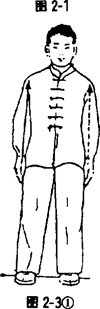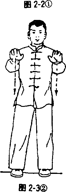 身体自然站立,两脚开立与肩宽,头正,肩松,精神集中, 呼吸自然(见图2-3①)。两手慢慢向前平举至肩高,肘微屈下 垂,手指自然张开,手心向下,眼看两手,同时吸气。此为“升” 式(见图2-3②)。两手下落时,按至腹前,松指屈掌,同时两腿