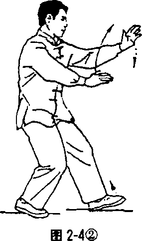 两腿自然开立(见图2?4①),重心移至右腿并屈膝,左 脚向前半步,脚跟着地,腿尖翘起,膝微屈;同时两掌掌心斜相 对向前上方举起,左掌指同鼻高,右掌在左肘内下方,掌指自 然分开,指尖朝前上方,眼看左掌(见图2-4②)。整个动作要 求沉肩垂肘,宽胸舒背,松腰敛臀,上体正直。上肢的肩、肘、手 与下肢的胯、膝、足均一一相合,即肩与胯合,肘与膝合,手与 足合。用意行气,呼吸自然。此势可左右势交换练习。