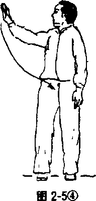 两脚开立与肩宽,两膝微屈,作单手云臂时,左手臂在体 侧不动,右手臂向左、向上、向右、向下划圆,手心向内,臂成弧 形,随左右转体的同时作划圆动作(图2-5①?④),当手臂向 左时作呼气,手臂向上时作吸气,当手臂向右下时,作呼气动 作。此式可以左右手交替练习,左右手同时依次配合练习,还 可以在并步、开步运动中练习。对呼吸的要求和身体各部位的 要求同前。