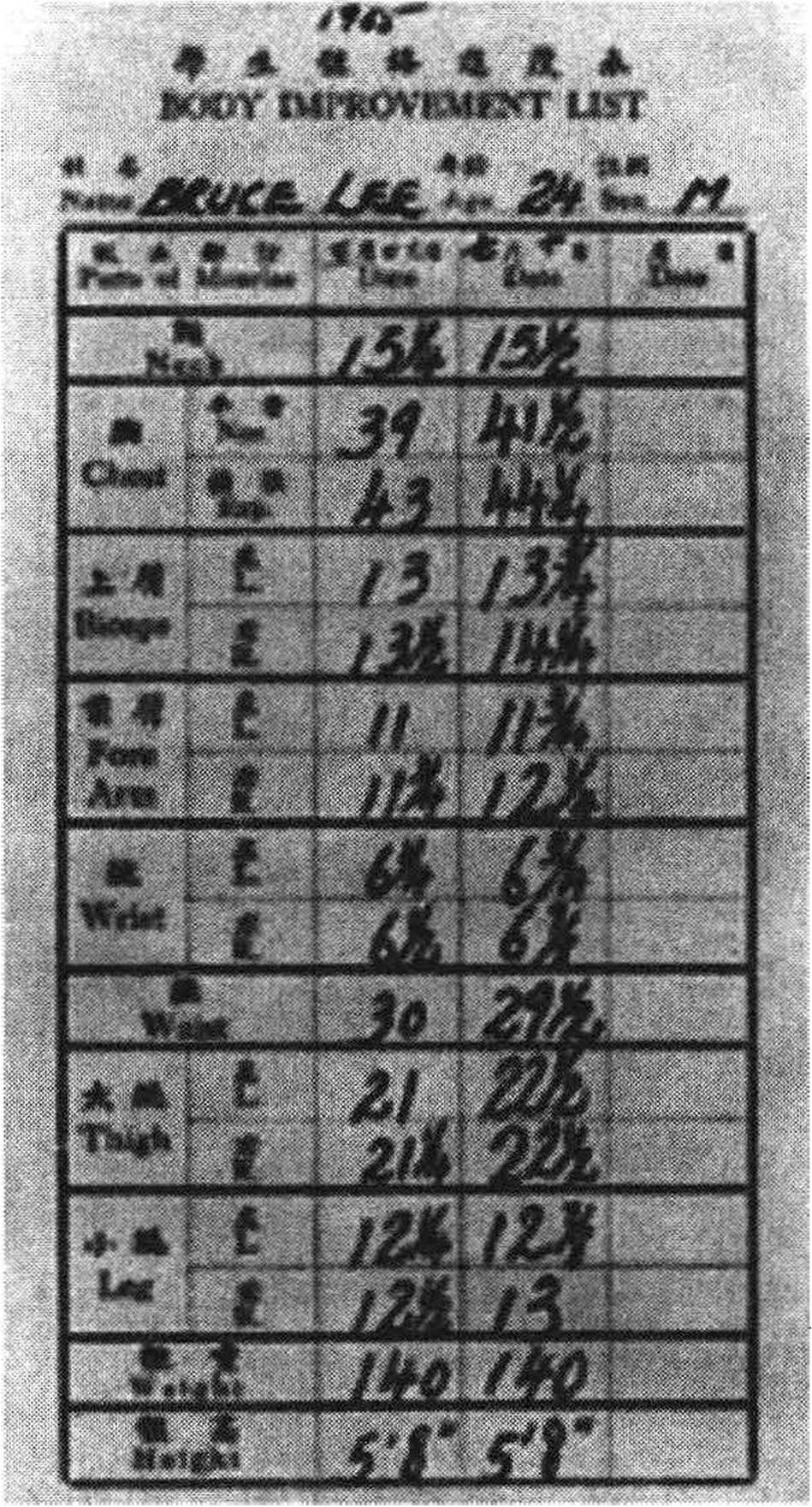 除了和朋友们探讨之外,李小龙还贪婪地阅读相关资料,不断地验证 他所读到的理论,制定明确的健身训练计划。李小龙开始了解关于健身训 练的某些基础原则,下面是他草草记下的一部分笔记: