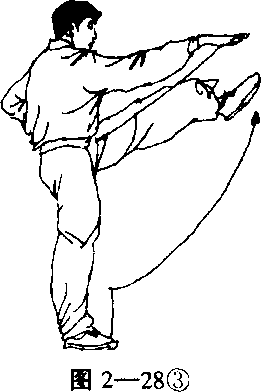 ② 上动不停,两腿屈膝,左腿向右上方摆,右腿用 力蹬地,使身体右转腾空,右腿向右上侧摆;同时两拳 变掌,掌心向下,从腰间由右向左依次拍击右脚面;左 脚自然下垂,眼看手的方向。(图2—25②)
