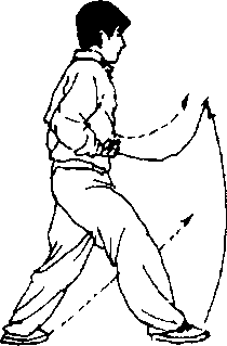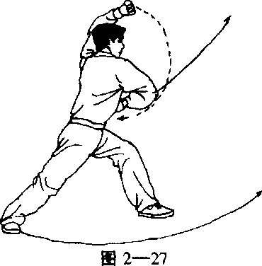 左腿落地,右腿向右方摆落成右弓步;同时两掌变 拳,右拳由胸前向右到体侧再向上屈肘架于头顶,拳心 向上;左拳由胸前向右下方冲至右腹前,拳心向内;眼 向左前方平视。(图2-26)