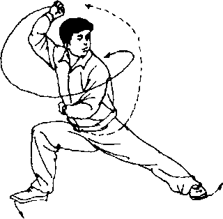 要点:拧腰盘肘要同时完成,要做到拳与脚合,肘 与膝合,肩于胯合。