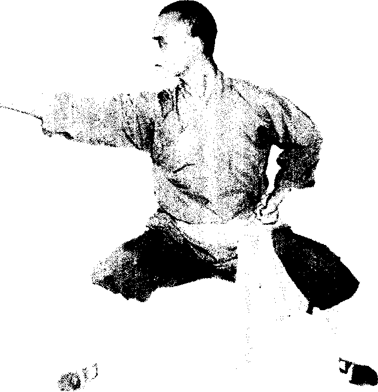 双拳收于腰间,体右转180度,右腿下蹲成左仆步:左拳 变掌顺左腿向前下方切出,掌刃朝前。力发于掌刃,目视左 方° (见图29)图30