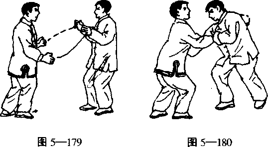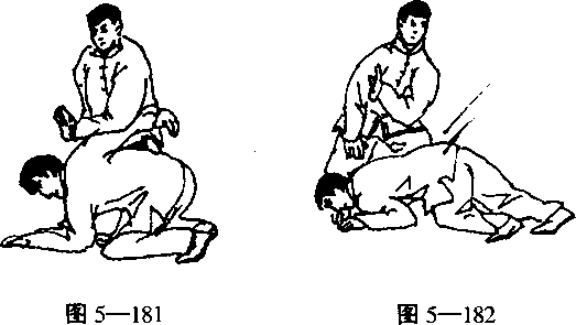 捆索于胸前;乙因受甲两手棚腕,产生向前下的抗 劲(图5—180)。甲顺乙抗劲,身体右后转,同时用 左手向右下冽乙右后肩部(图5—181)。乙因受甲冽 劲而前栽倒地(图5—182)。