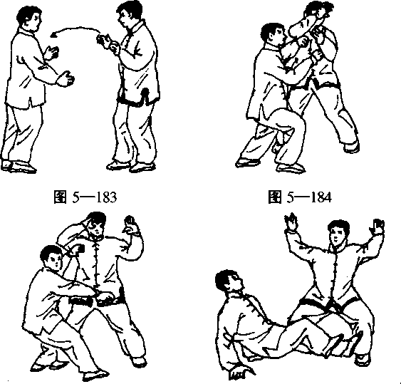 甲乙双方五行桩对峙(图5—183)。甲右脚前进 一步,同时右肘上举进身,右肩紧贴靠乙胸部(图 5—184)。,甲右肘向外顶靠乙胸,逼乙后摔(图5— 185)。乙因受甲肘逼而后坐仰摔于地(图5—186)。