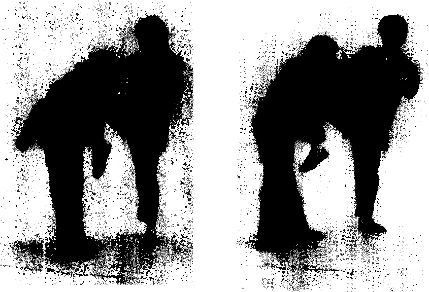 2.后腿冲膝:身体重心前移,前腿直立或稍屈;身体 内转,后腿屈膝,以膝盖前撞或斜线向前上方冲击,力达 膝盖。