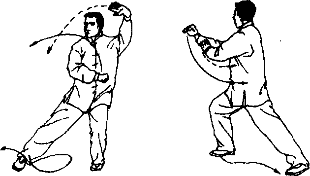 【内意活动】 意想“气”向左脚下沉立稳,松右胯外 旋弧形外摆有拐踩之意,待脚一落地,由右脚跟过渡到全脚 掌,即想“气”向脚心下沉踩实,劲起于右脚,上传过背, 全身之“气”贯于右拳背,意贯右拳背。