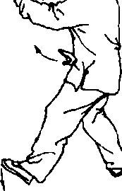 3.丁步抱球:上体后坐,左脚尖外徽,身体左转;同 时,左手翻掌向下,臂平屈胸前,右手经腹前划弧与左手成 抱球状;右脚跟步至左脚内侧,脚尖着地;眼看左手。(图 224、 225)