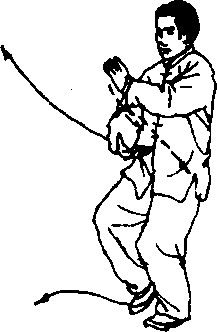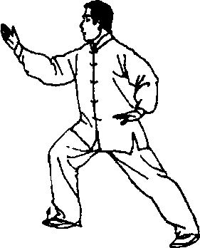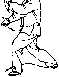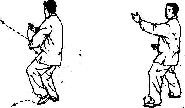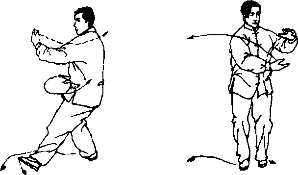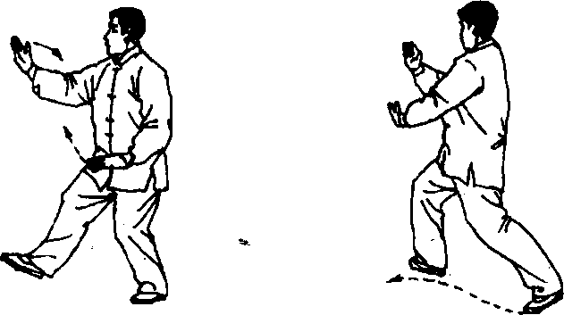 1.丁步抱球:上体后坐,身体重心移于左腿,右脚尖 翘起微向外撒,随即右腿前弓,身体右转,重心移于右腿;