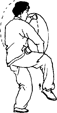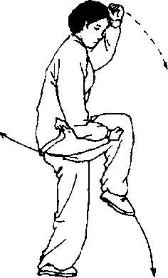 2 ,提膝翻臂:上体右 转(胸向东偏南);左腿伸 起,右腿提膝同腰高,脚尖