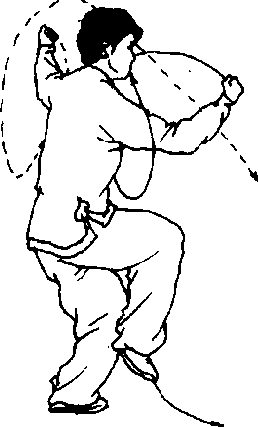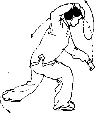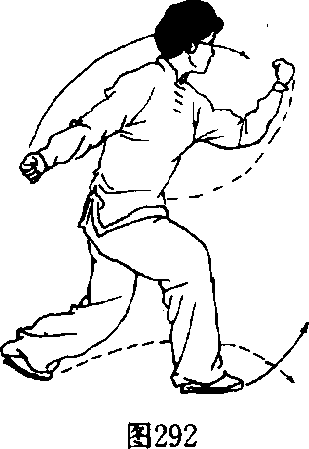 图291自然下垂;同时左拳向右、 向下、向左经腹前外旋向 左、向上屈肘举于肩左前 上方,拳稍高于头,拳心向 右。右拳向左、向上在胸前 和左臂相会时经左前臂内 侧再向上、向右经面前向 下划弧,外旋翻臂下压于 右膝外侧约10厘米处,右 臂屈肘,拳心向上;目视右 拳,(图291)