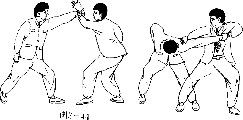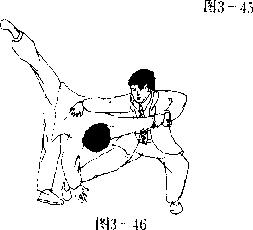 抢表情形:我在路上自然行走,贼由我正面走来,用左手 抓住我左臂,欲用右手摘我手表(图3 — 44)。防抢顺序:我左手向下、向里、向上、向外反抓住贼左腕, 向左回领,同时我左后转身,前上右脚于贼左腿前方绊住其左 腿,并用右掌前下压贼左肩(图3 — 45)。动作不停,我右脚后 挂贼左腿,使之前摔(图3 — 46)。动作要点:反抓腕要及时;转身、领臂、上步、压肩要一致; 挂腿要快速、猛狠。