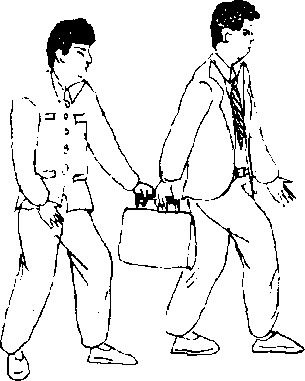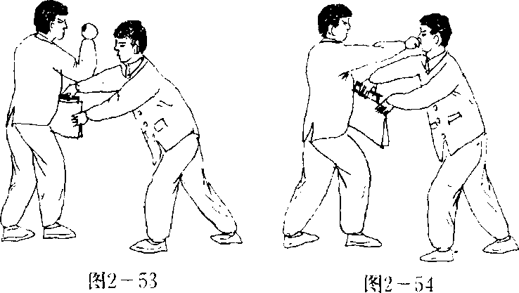 图2 - 55图2 - 55夺包情形:我右手提提包在路 上行走;贼由我身后,用左手抓住提 包向下夺(图2—55)。图2 - 55图2 - 55防夺顺序:我速右后转身,向右 后拉包(图2 — 56)。动作不停,用左 弹腿弹踢贼裆部(图2—57"动作要点:回拉包要及时;弹踢 贼裆要突然、快速、有力。