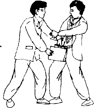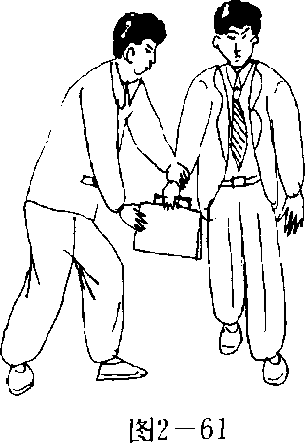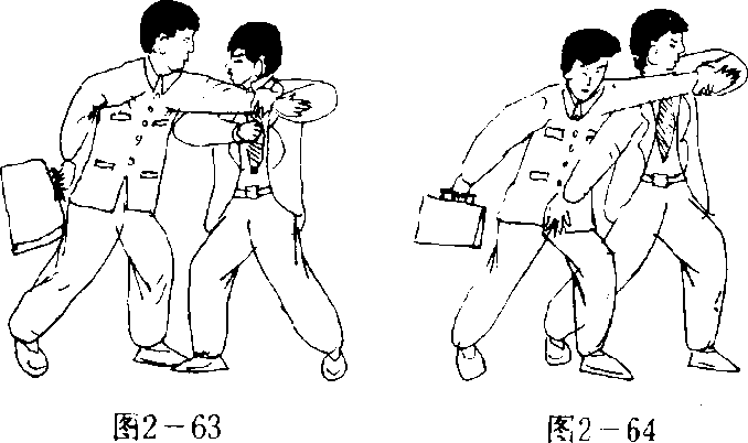 夺包情形:我右手提提包在路上行走;贼由我右侧,用左 手抓我右腕,用右手抓我提包下夺(图2 — 61)。防夺顺序:我左手爪住贼左腕向左回领〔图2 — 62)。动作 不停,我在左领膂的同时右手松开提包,屈肘向贼左肋顶击 (图2 — 63)。接上动作,我右掌向下、向后拍击贼裆部(图2- 64)。动作要点;抓腕领臂要及时;领臂顶肘击肋要一致,顶肋 要猛、狠;拍裆要突然、快速、准确、有力。