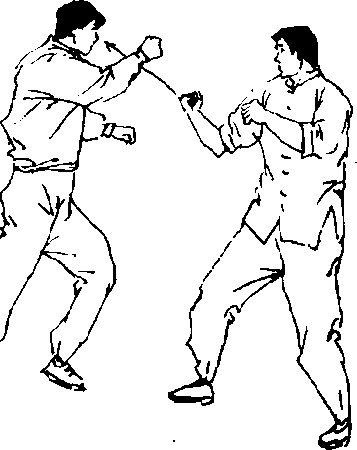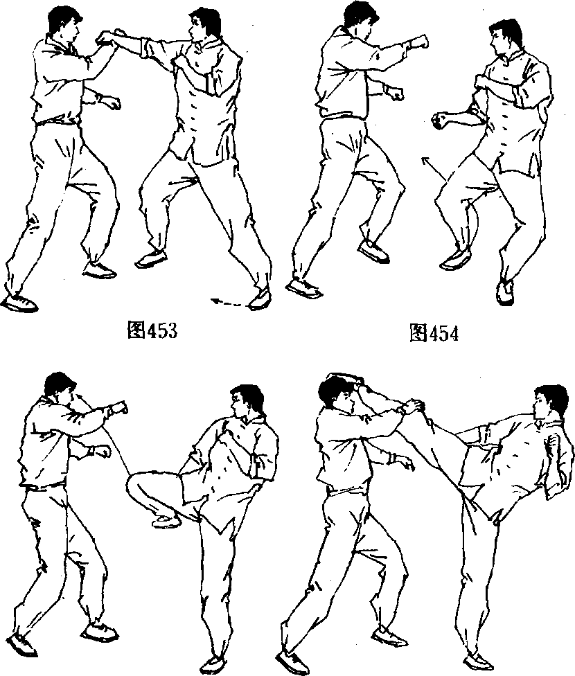 动作要领:在截拳道中,这是一种声东击西,惊上取下,再 惊下取上的有效战例。而且假动作的速度要适中,要有足够的 时间让对、手产生错误的反应,但是时间不宜过长,因为时间过 长会使对手利用这段时间做好阻止攻击的准备。在本招法中, 要尽力迫使对手抬高防御,从而为勾踢腿攻击对手中盘要害