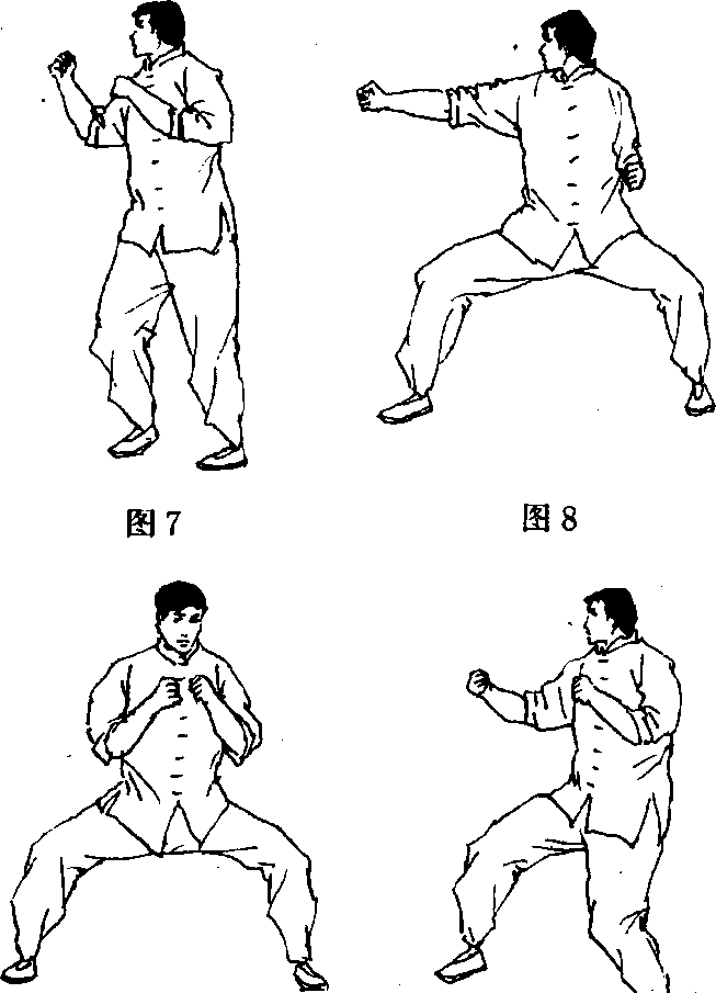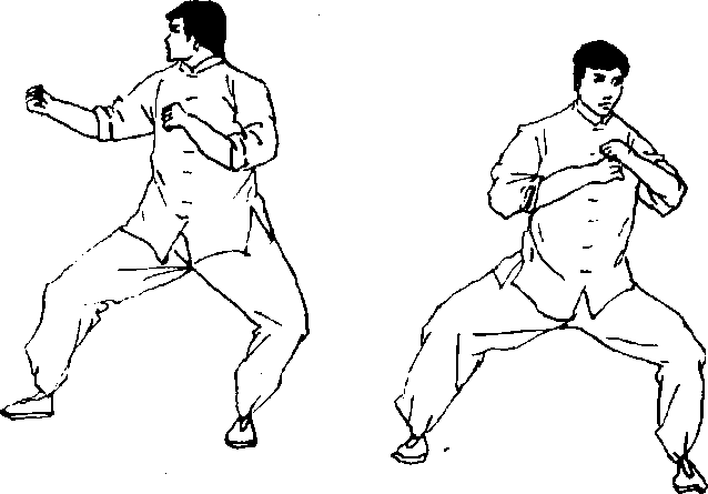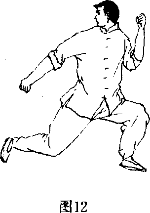10. 此姿势象猫式站立那样,身体重量过多地压在后脚 上,这样就限制了向前运动的灵活性。特别是当两脚站件较 宽,而又为了打出一拳时,就不得不把身体重心移向前脾,但 这就暴露了攻击的意图(图12)。