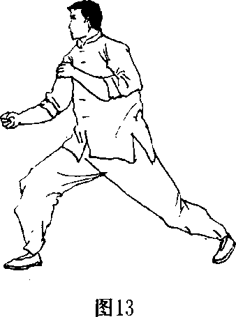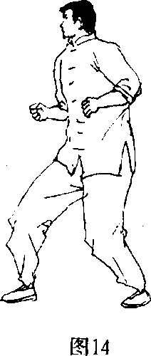 12-两手置于腰际,身体和头部完全暴露,容易被击中。 并由于后腿处于十分别扭的位置,使裆部毫无必要地暴露了 出来(图14)。