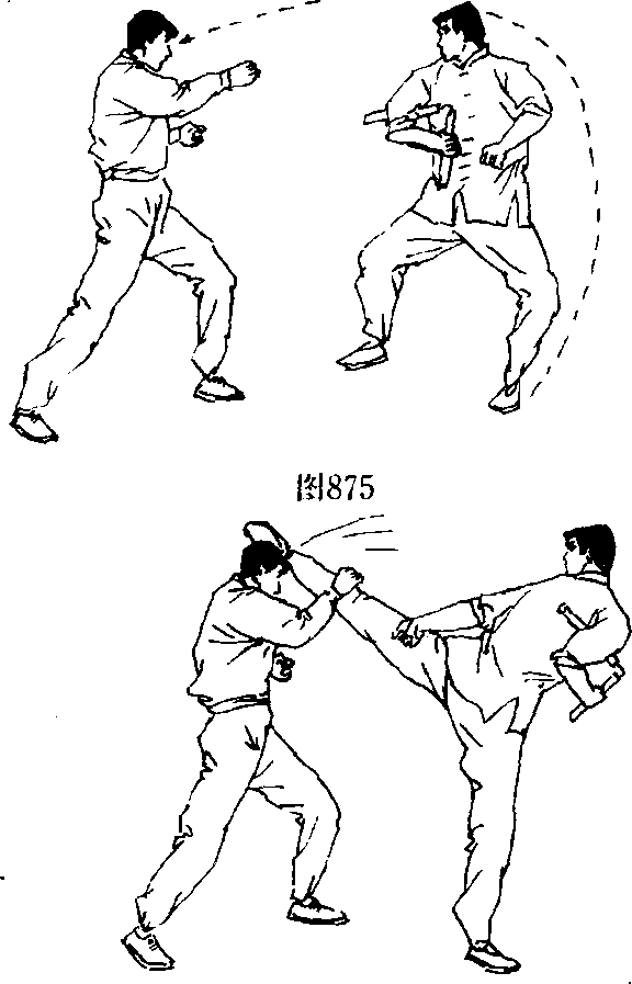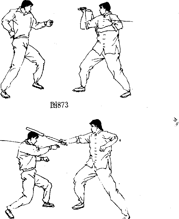 运用方法:当对手持刀或空手冲来时(图873),李小龙可 将置于臂后的二节棍快速挥起,并去重击对手的头部要害(图 874);然后,李小龙可抓住战机,并再抬起左脚(图875),用一 记迅猛的旋踢腿将对手击昏或击倒在地(图876)。